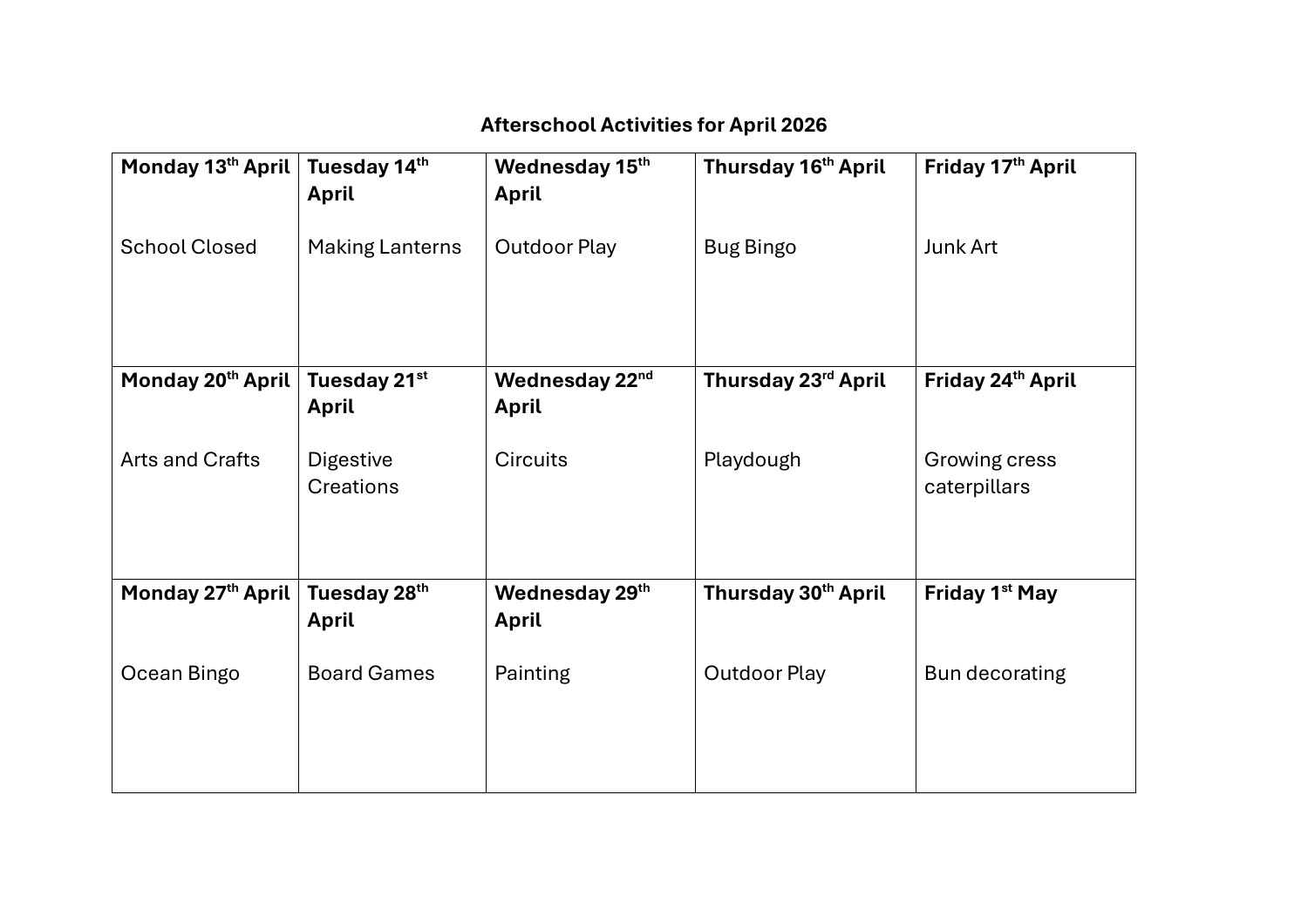 The school also runs an afterschool for P1 - P7 Monday to Thursday 2pm - 4.55pm and Friday 2pm - 4pm. Parents are able to book these sessions on school money. Pupils will receive a snack each day. Please see attached timetable of activities the school is providing for this month.